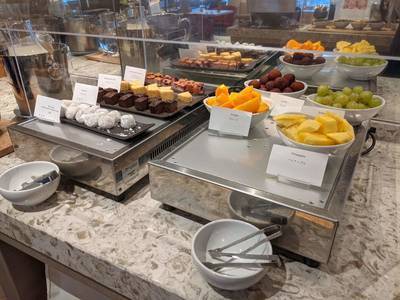 デザートはフルーツ、大福、ブラウニー、バームクーヘン、ベリーケーキ。